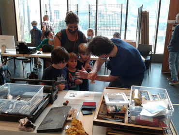 Le principe : Flux tendu organise la chaîne du livre en équipe pour créer un ouvrage à la demande. Un enfant commande une nouvelle en proposant la première phrase à un(e) auteur(e) qui écrit une histoire en 20 minutes en improvisation directe, puis le texte passe à la correction, puis à la maquette. Pendant que le cahier intérieur est mis en page et imprimé en numérique, un imprimeur typographe imprime la couverture avec des caractères en bois sur presse à épreuve (atelier participatif). Puis le tout est relié par deux agrafes avant de repartir sur l'atelier illustration. A la fin, l'ouvrage est estampillé "1/1 exemplaire". C'est la plus petite édition du monde, avec un texte personnalisé né dans l'heure, une couverture et des illustrations originales.