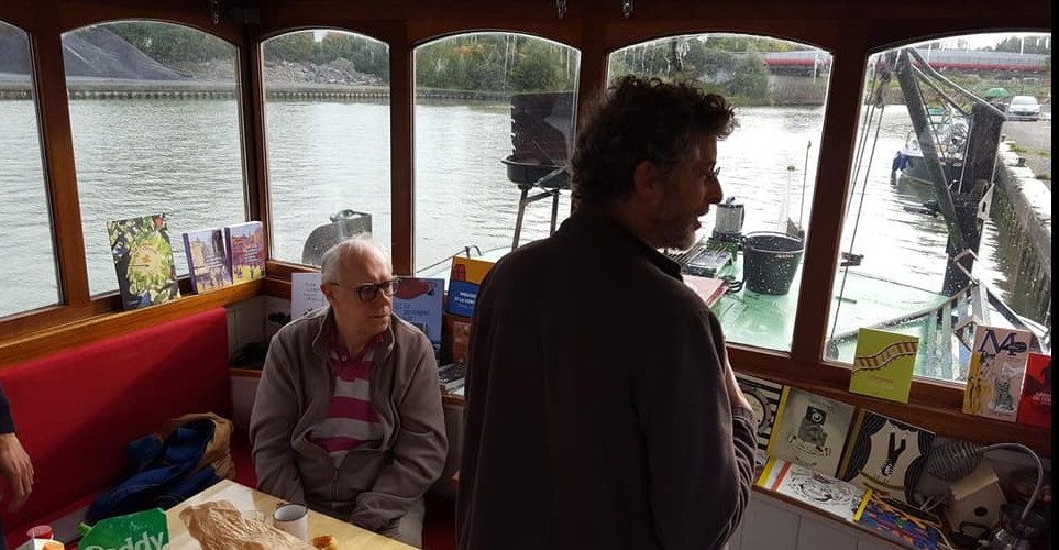 Naviguer sur la Somme, c'est lent. Très lent. Encore plus que sur le Saint-Quentin, et ne parlons pas du canal du Nord qui, par comparaison, fait figure d'autoroute. Après moult lacets, écluses et ponts-levis dans la verdure magnifique, nous voilà donc arrivés à Amiens, avec une journée de retard sur le planning. Car oui, il y en avait un, de planning, qui a explosé en route. À peine amarrés au port d'amont que voilà déjà deux vaillants libraires ; Philippe de la librairie Labyrinthe, et Stéphane de Pages d'encre. Notre rafiot fait sa petite sensation. On a troqué le petit dej contre une binouse. Nous apprenons avec stupeur que la cathédrale d'Amiens peut contenir deux Notre-Dame de Paris car tellement grande. Sceptiques, nous sommes allés vérifier. Faut pas exagérer. En pièces détachées peut-être. Mais bon. Un petit peu chargée à notre goût. Le gothique rayonnant flamboyant ça va 5mn. Vite, retournons au bateau et savourons la simplicité d'une vie flottante, en attendant Julie du Cultura d'Amiens, qui a bien voulu faire des heures sup ce soir. Alors à tout à l'heure !